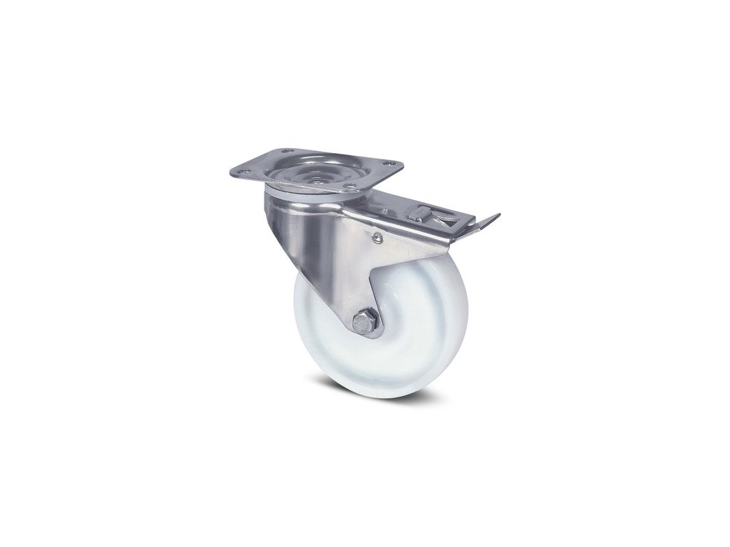 Otočné kolečko s totální brzdou, v zadní části kola, Vidlice vyrobena z nerezové oceli, dvojitá kuličková dráha v otočné hlavě kolečka, kolo se šroubem a maticí , uchycení s plotýnkou. Střed kolečka vyroben z polyamidu, kluzné uložení