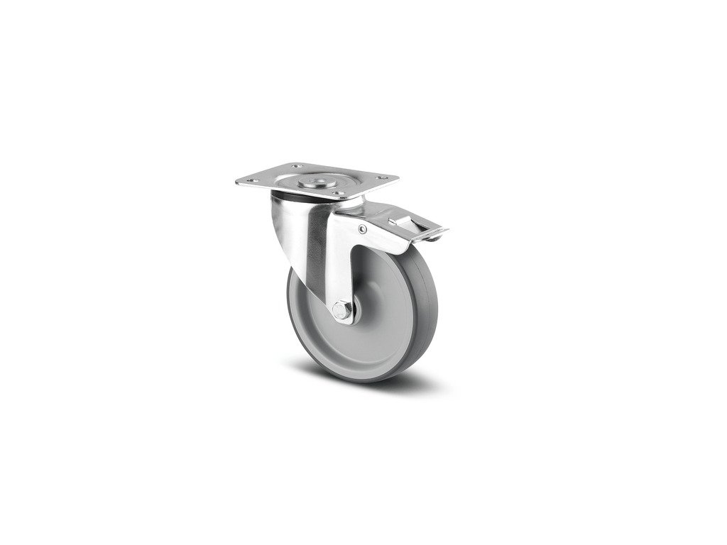 Otočné kolečko s totální brzdou, v zadní části kola, Vidlice kolečka vyrobena z ocelového výlisku, pozinkováno, dvouřadá kuličková dráha v otočné hlavě, kolo uchyceno šroubem a matkou, uchycení s plotýnkou. Střed kolečka vyroben z polypropylénu, Běhoun: TENTEprén (termoplastická guma), šedá-neznačkující, jehlové ložisko
