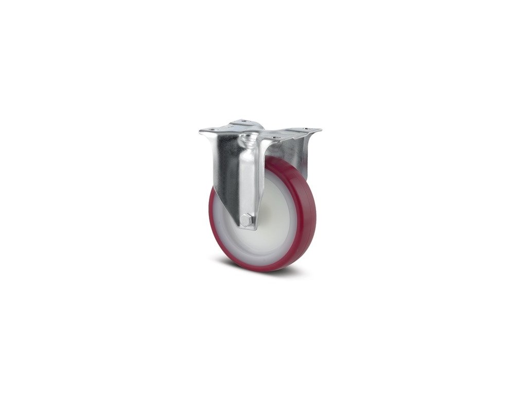 Pevné kolečko, Vidlice vyrobena z ocelového výlisku, pozinkováno, kolo uchyceno středovým šroubem s maticí, uchycení s plotýnkou. Střed kolečka vyroben z polyamidu, vysoké zatížení, kluzné uložení, Běhoun: polyuretan, jehlové ložisko